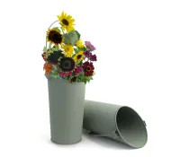 - 5.25"dia top x 8"H front x 11.25"H back x 4"dia bottom x 15" tall handle